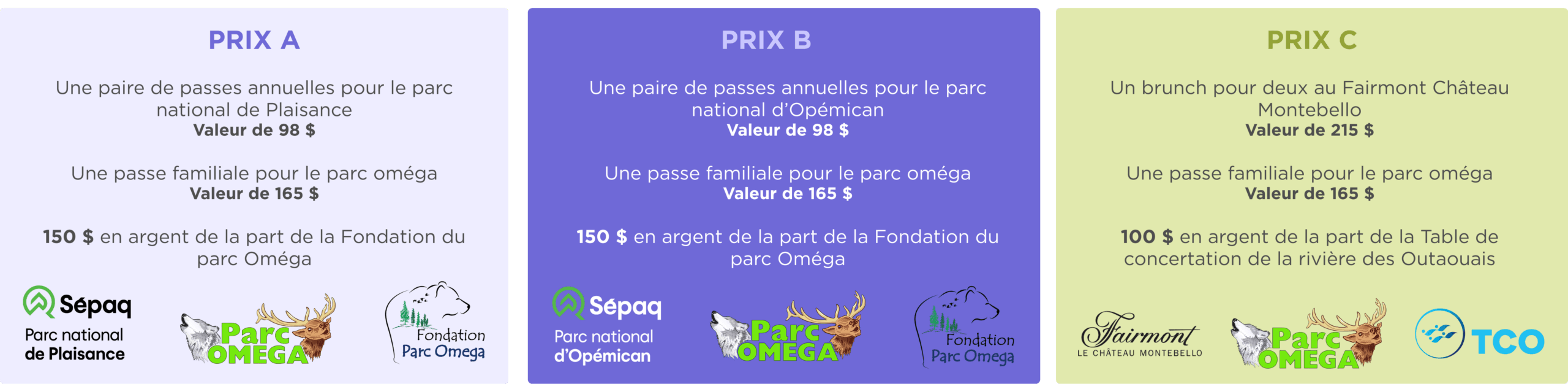 Grâce à nos partenaires, le parc national de Plaisance, le parc National d’Opémican, le Fairmont Château Montebello, le parc Oméga et la Fondation des Amis du parc Oméga, la TCO est heureuse d’offrir ces trois prix: